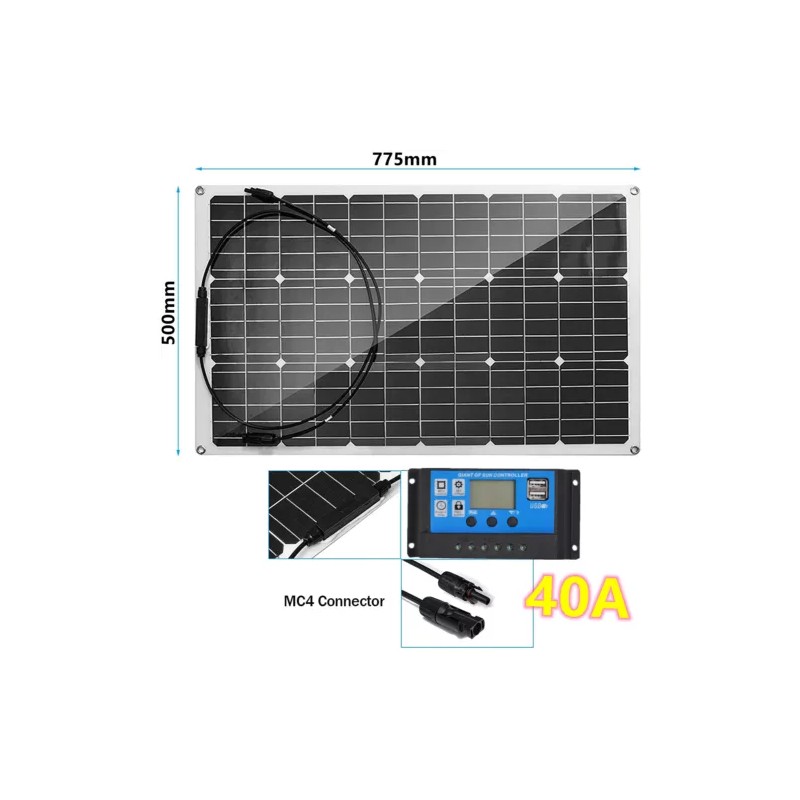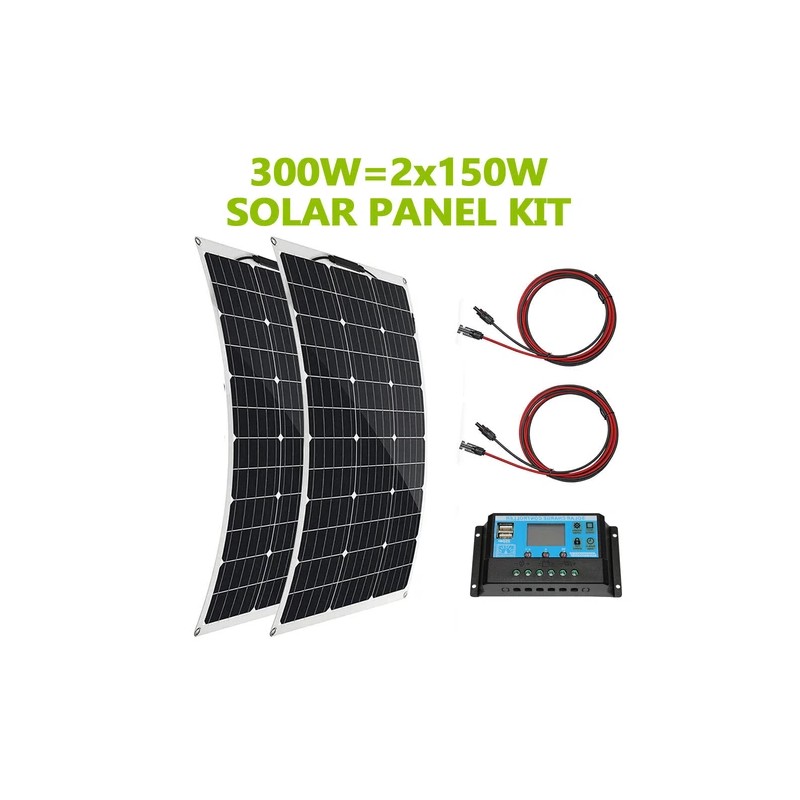 300W Solar Panel Kit Power Generator with 40A Solar Controller Home RV Camping Emergency Power Brand new and high quality - With a semi-flexible design, you can bent the solar panel appropriately to suit a wider range of applications. - The solar panels comes with high conversion rate, high stability and good durability. - It has a single crystal R chip and can be used in any place and situation like automobiles, homes, boat, motorcycles, etc. - With the strong sun in the summer, the solar panel can efficiently convert solar energy. - Equipped with advanced polyethylene coating technology, the surface of the battery is plated with dark blue reflective film. - The solar panels can withstand all kinds of environments with high waterproof performance. - Anti-scratch, non-foaming, easy to cl