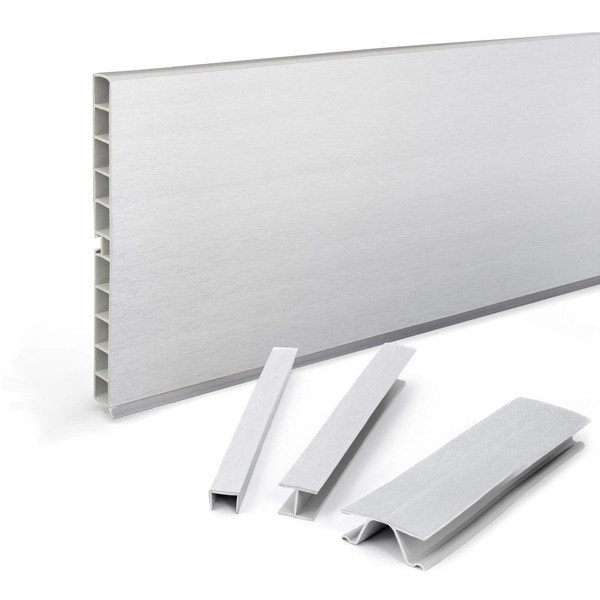- Box contents: you can order the skirting board in different lengths – from 1.5 m to 10.5 m. Detailed description can be found at the bottom of the auction. The end strips that are over 150 cm long are sent in sections with connectors. Each perfectly matching accessory part for the kitchen rails such as connectors, end caps, corner connectors and the base clamps are available in our shop.