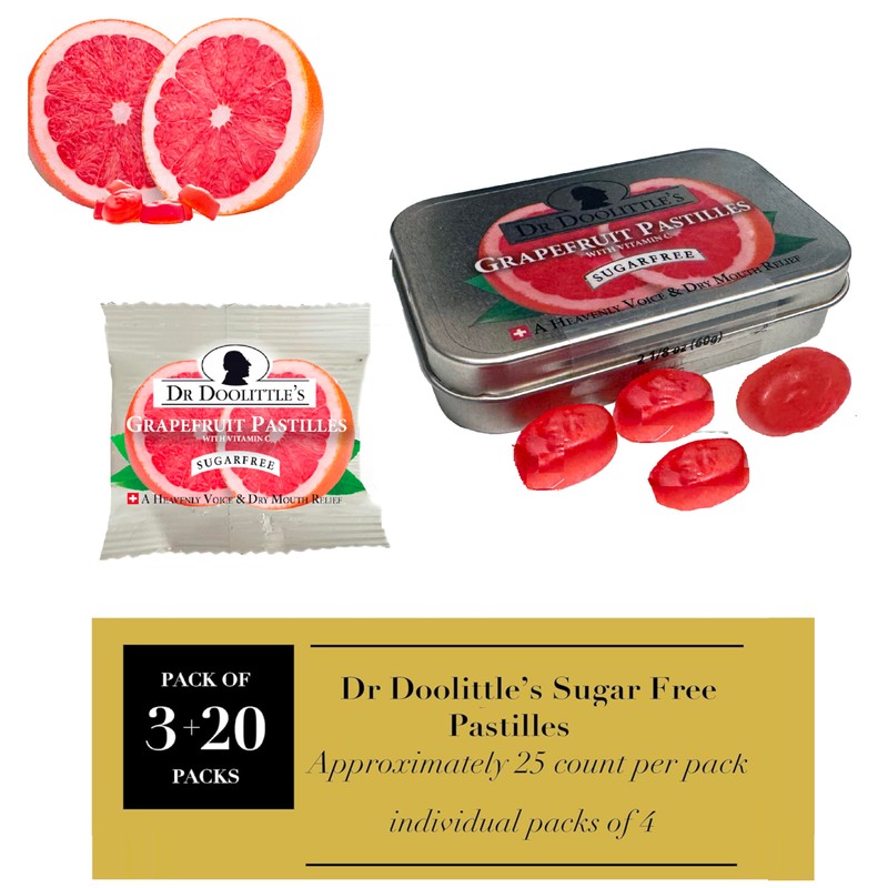 Dr. Doolittle’s Sugar Free Pastilles with Stevia for Voice and Throat, Grapefruit Flavor, Multipack of 2.12 Ounce Tin, 3 Pack and .33 Ounce Travel Size Bag, 20 Pack