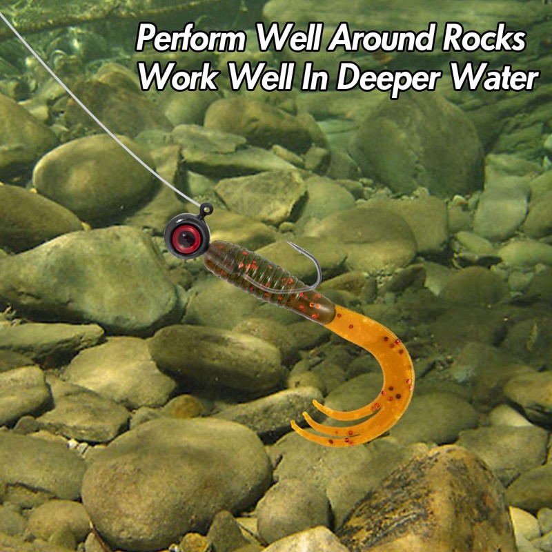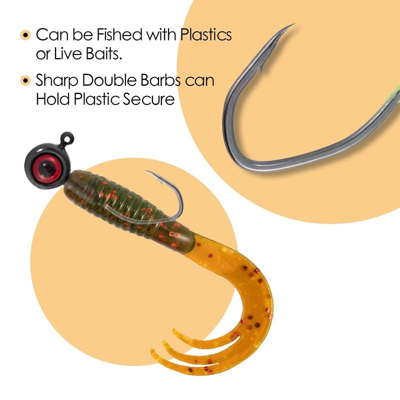 - Easy to install your live baits or plastic. Make your soft plastic look like live prey. Eye jig head has sharp double barbs that can hold plastic securely.