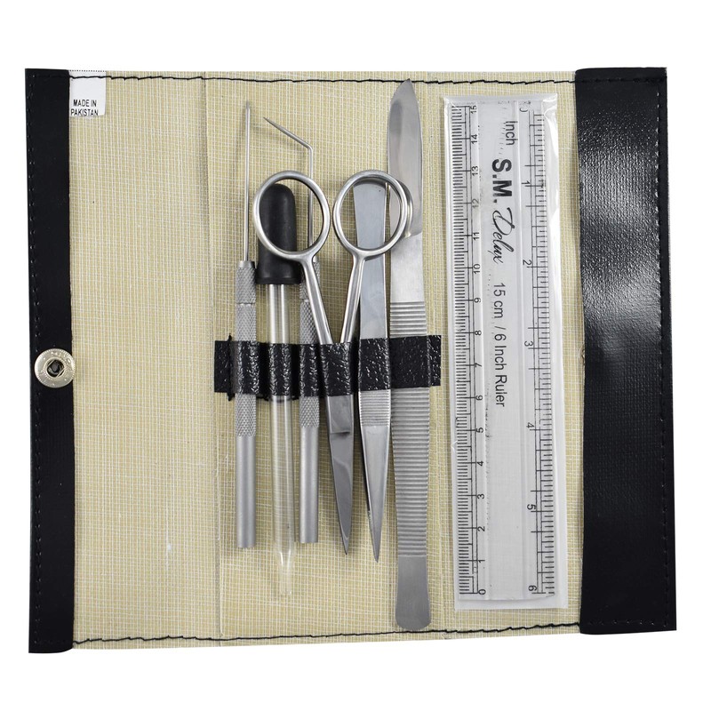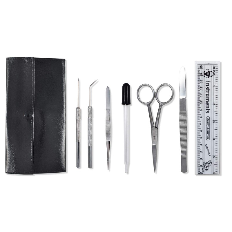 - This kit contains two teasing needles (one straight and one bent), one dropper with a rubber bulb, one stainless-steel dissecting student forceps, one dissecting scissor, one razor blade, one ruler, two teasing needles and a plastic snap pouch in which all the tools are encased.
