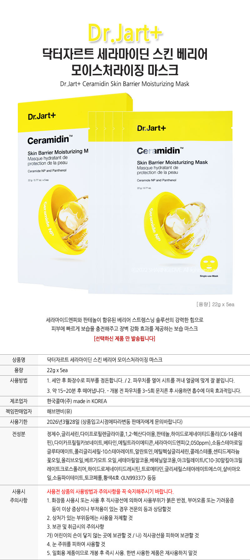 Dr. Jart+ Ceramidin Skin Barrier Moisturizing Mask 1 box (22g x 5ea) / 닥터자르트 세라마이딘 스킨 베리어 모이스처라이징 마스크 1박스(22g x 5ea)