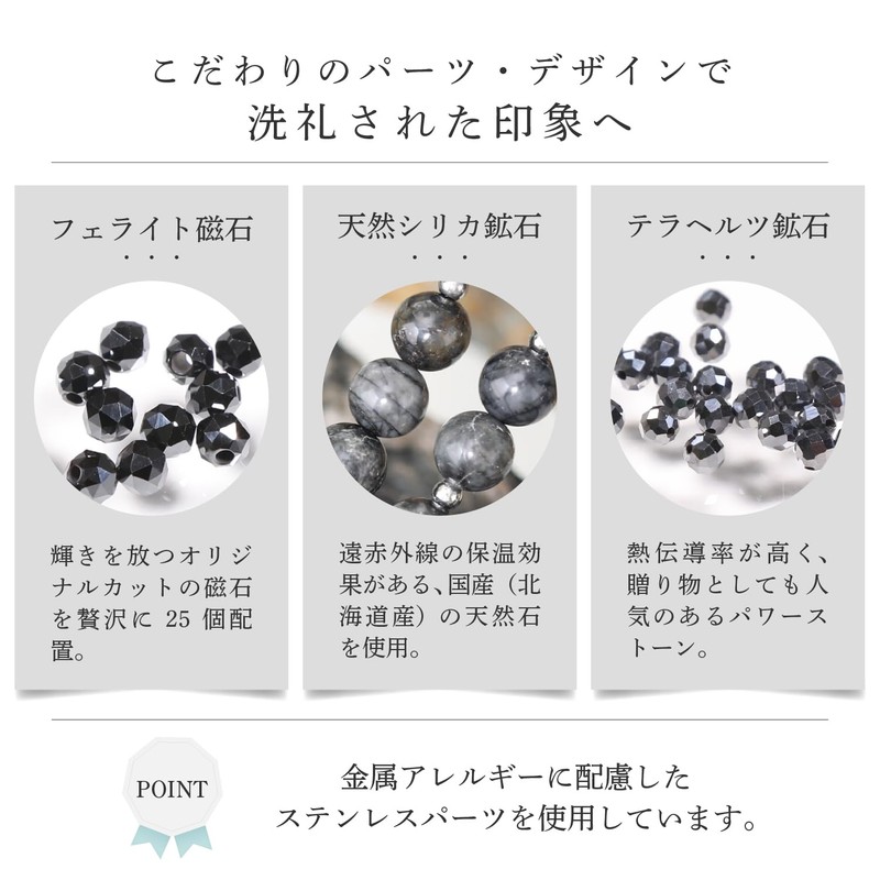 - 【 使用パーツ 】フェライト磁石(25個使用)・天然シリカ鉱石・テラヘルツ鉱石・ステンレスボール(金属アレルギー対応)