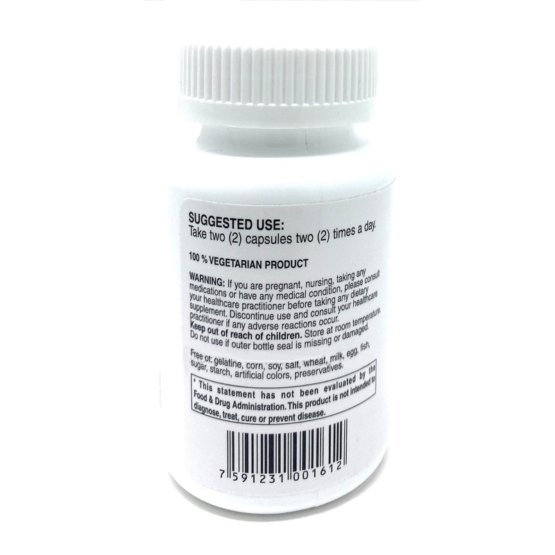 It has no gelatin, corn, soy, salt, flour, dairy products, eggs, fish, sugar, starch, or preservatives.