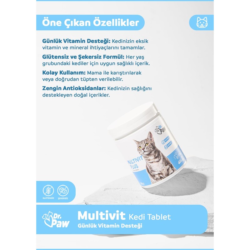 - Veteriner hekimlerin uzmanlığıyla geliştirilen ve gıda kalitesinde (food grade) içeriklerle üretilen Dr. Paw - Multivit Plus, glütensiz ve şekersiz formülü sayesinde kedinizin günlük ihtiyaçlarını karşılamak için mükemmel bir takviye sunar.