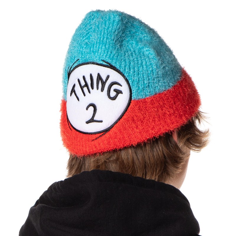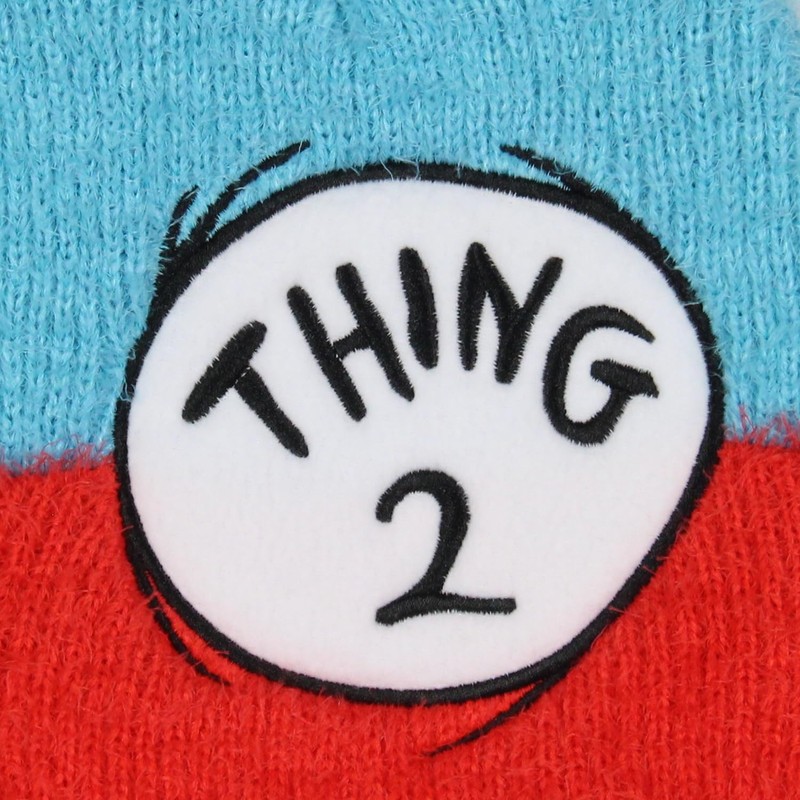 - Great Thing 1 and Thing 2 Design: Embrace the whimsical world of Dr. Seuss with this fun beanie, featuring Thing 1 and Thing 2 embroidered patches on either side. The playful blue beanie is paired with a bold red cuff, bringing the Cat in the Hat style to life. Whether you're a fan of the beloved story or just love playful accessories, this beanie adds a dash of fun to any outfit.