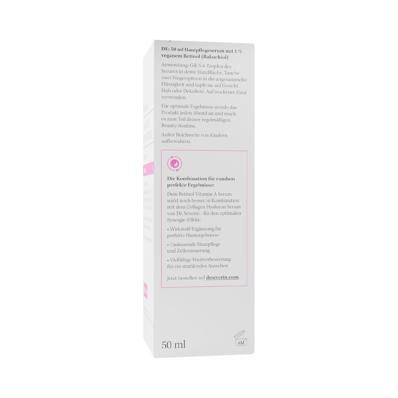 ProduktbeschreibungenEntdecken Sie die Welt innovativer Hautpflege mit unserem Dr. Severin 1 % Bakuchiol Vegan Retinol Serum Ultra. Hergestellt mit einer wirksamen Mischung aus pflanzlichem Bakuchiol, Vitamin E und F, pflegt dieses Serum tiefgehend, f1llt essentielle Lipide auf und verbessert die Elastizit?t, sodass Ihre Haut erfrischt und revitalisiert wird. Unsere Formel nutzt die Kraft luxuri?ser Pflanzen?le und -extrakte, um Trockenheit zu bek?mpfen und bereits ab der ersten Anwendung unglaubliche Geschmeidigkeit zu bieten.Bakuchiol, als sanftere, nat1rliche Alternative zu Retinol gefeiert, bietet ?hnliche Vorteile ohne die damit verbundenen Reizungen. Vitamin E wirkt als fettl?sliches Antioxidans, das Ihre Haut vor sch?dlichen freien Radikalen sch1tzt und ihre nat1rliche Regeneration unterst1tzt. Vitamin F, bestehend aus essentiellen Fetts?uren, f?rdert die Feuchtigkeitsbindung, hilft bei Akne, Trockenheit und Faltenreduktion. Marula?l, bekannt f1r seine feuchtigkeitsspendenden und verj1ngenden Eigenschaften, f?rdert einen gesund aussehenden Teint, w?hrend Ylang Ylang eine Vielzahl therapeutischer Vorteile bietet, darunter entz1ndungshemmende und feuchtigkeitsspendende Eigenschaften. Avocado?l, reich an Vitamin E und anderen N?hrstoffen, pflegt und befeuchtet Ihre Haut, f?rdert die Kollagenproduktion und unterst1tzt den Heilungsprozess. Schlie?lich hilft Rosmarin?l, voller Antioxidantien, die Haut vor vorzeitiger Alterung zu sch1tzen, kontrolliert die ?lproduktion und bietet antibakterielle Vorteile.Heben Sie Ihre Hautpflegeroutine mit unserem Dr. Severin Serum an und genie?en Sie einen nat1rlich strahlenden und gesund aussehenden Teint.WarnhinweiseWir empfehlen Menschen mit sensibler Haut, vor der ersten Anwendung einen Patch-Test durchzuf1hren, um eine unerw1nschte Reaktion auf einen Inhaltsstoff ausschlie?en zu k?nnen. Gib dazu eine kleine Menge des Produktes auf die Innenseite deiner Armbeuge. Sollten nach 24 Stunden R?tungen sichtbar sein oder ein Juckreiz auftreten, empfehlen wir dir, das Produkt nicht weiter zu verwenden. Bei Bedenken oder Unsicherheiten wende dich bitte an deinen Arzt.