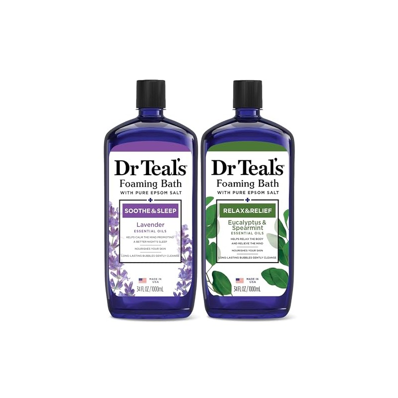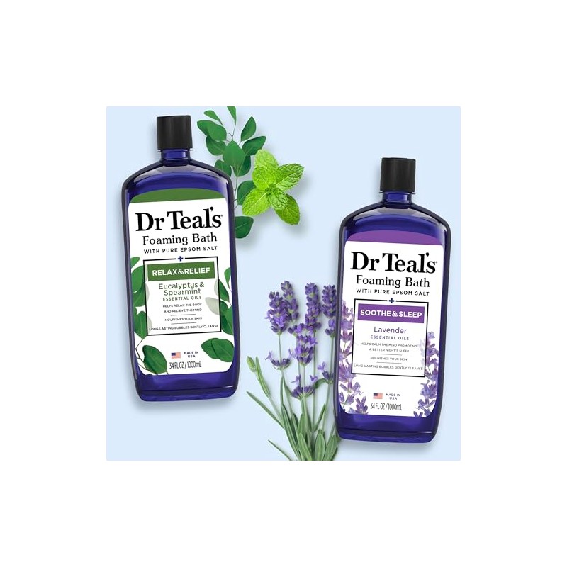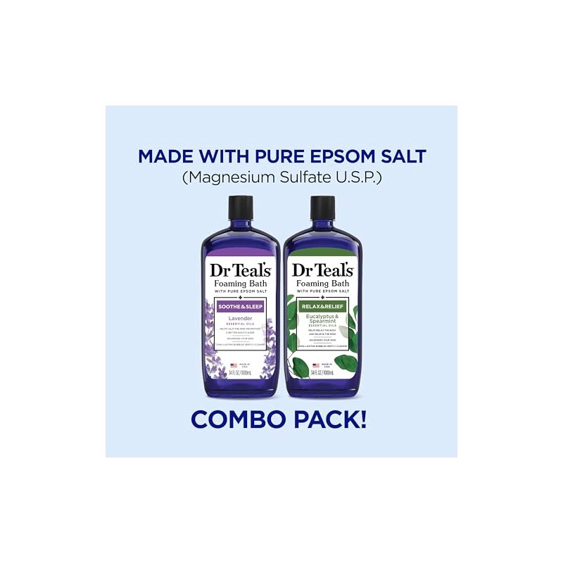 Luxuriate in two kinds of stress-reducing baths with Dr Teal's Lavender & Eucalyptus Foaming Bath Duo with Pure Epsom Salt. This duo is perfect for relaxing both body and mind. Lavender has a soothing and calming effect that helps promote a better night's sleep.. Eucalyptus and spearmint help reduce stress and rejuvenate the mind so you feel refreshed. Mix with your favorite Dr Teal's Pure Epsom Salt Soaking Solution to create an exfoliant. Dr Teal's products are vegan and cruelty-free and contain no harsh ingredients such as parabens and phthalates..