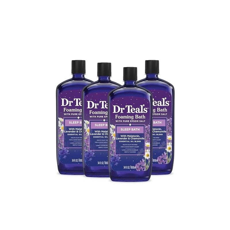 Dr Teal's Foaming Bath with Pure Epsom Salt, Sleep Blend with Melatonin, Lavender & Chamomile Essential Oils, 34 fl oz (Pack of 4) (Packaging May Vary)