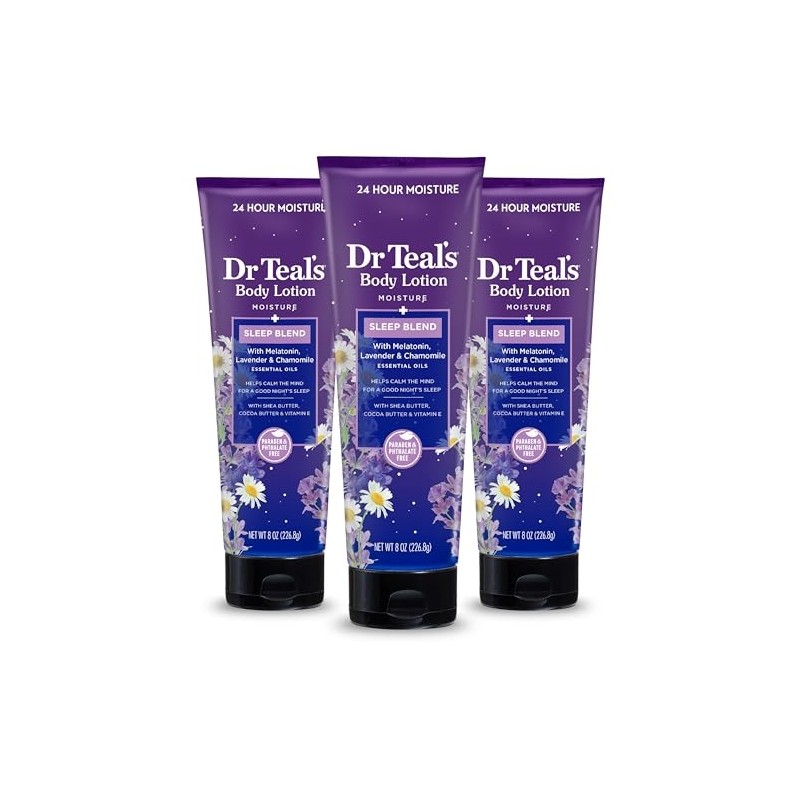 Dr Teal's Sleep Body Lotion, 24-Hour Moisture, with Melatonin, Lavender & Chamomile Essential Oils, 8 fl oz (Pack of 3)