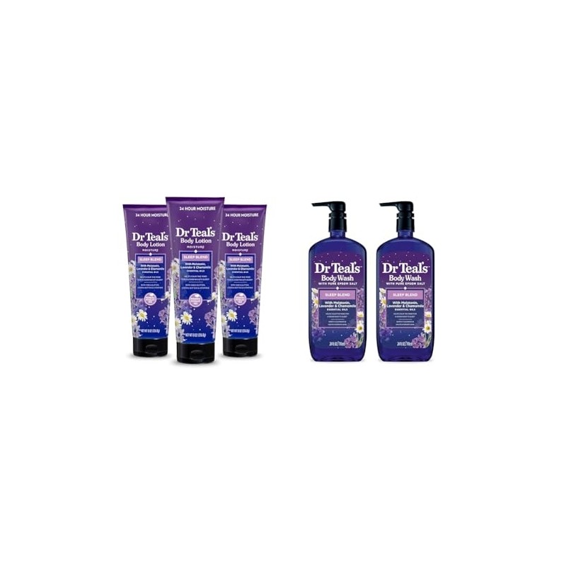 Enjoy a relaxing bedtime routine with this bundle of Dr Teal's Sleep products. The bundle includes Dr Teal's Sleep Body Lotion (3 packs, 8 fl oz each) and Dr Teal's Sleep Blend Body Wash (2 packs, 24 fl oz each) to moisturize your skin and help you unwind before bed. The body lotion contains a soothing blend of melatonin, lavender, and chamomile essential oils to calm the mind and encourage relaxation. Formulated with nourishing shea butter, cocoa butter, and vitamin E, this lightweight lotion provides 24-hour moisture while you sleep. Complement the lotion with the Sleep Blend Body Wash, featuring a mix of melatonin, lavender, and chamomile essential oils to promote tranquility. The wash also contains pure Epsom salt to refresh skin's appearance, along with moisturizing shea butter, aloe vera, and vitamin E. Use these calming, skin-softening products together at bedtime to enhance your evening routine and prepare your mind and body for sleep.