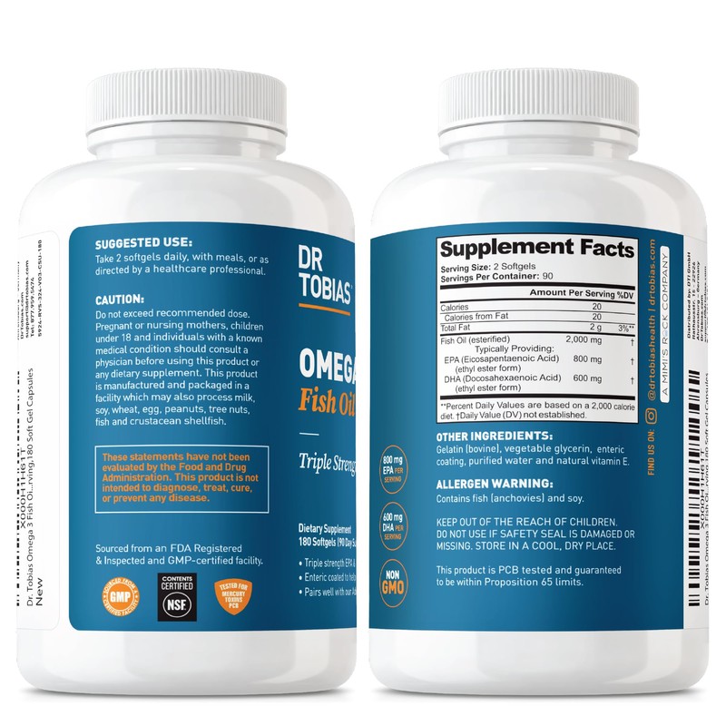 Dr. Tobias Dr. Tobias Omega 3 Fish Oil, 2000mg Triple Strength with 800mg EPA 600mg DHA Per Serving, Fish Oil Omega 3 Supplements for Heart, Brain & Immune Support, 180 Softgels, 90 Servings
