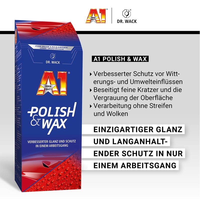 - A1 polish and wax: only the best for your car. With the new formula of our 2-in-1 product, you can give your paint an even more brilliant shine and seal it at the same time. The product is also suitable for polishing machines.