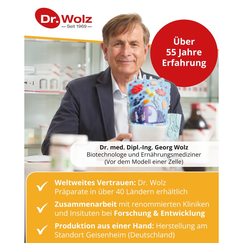 Product descriptionOrthomolecular supplement with vital enzymes, amino acids, minerals, vitamins, trace elements and biological protective substances Zell Oxygen plus is a protective combination of vital substances from Dr. Wolz for healthy cell function The effect of Zell Oxygen plus has been proven in in-vivo and in-vitro studies. A glass full of the richness of valuable substances that supply and protect cells every day. Why are Dr. Wolz enzyme yeast cells not comparable with other yeasts? - Baking yeasts continue to ferment in the body. - Beer yeast is a waste product in breweries. It is heated, processed as powder, flakes or tablets and does not have an enzyme effect. - The enzyme yeast cells based on the special Dr. Wolz process are cultivated especially using wheat germ extract and fruit juices rich in vitamins by adding oxygen. They remain biologically active but do not proliferate in the body. The Dr. Wolz enzyme yeast cells are extremely thin walled and can therefore be perfectly exploited by the human organism. Dr. Wolz enzyme yeast cells contain a huge number of biologically active natural cellular components from an orthomolecular perspective. A glass full of the richness of valuable substances that supply and protect cells every day as: no two yeasts are the same C Dr. Wolz enzyme yeast cells are therefore a speciality. What are enzymes? Enzymes, life's ignition sparks, are proteins that in fact allow the metabolic processes in the body to function at all. They are also necessary for digestion and build up new biological compounds, regulate the metabolism or dispose of the waste from the cells. To protect our cells from oxidative stress During stress phases to support with illnesses and physical stress To reduce fatigue and exhaustion With a deficient dietIngredientsYeast cells, Fruit juice concentrates (Orange, Pineapple, Grapefruit, Lemon, Sea Buckthorn), Apple juice from apple juice concentrate, Vitamin yeast, Honey, Alcohol (originates naturally during fermentation process), Wheat germ oil, Acerola powder, Vitamin C, Selenium yeast, Vitamin E Acetate of natural source, Zinc yeast, Pantothenic acid, Vitamin B6, Vitamin B2, Vitamin B1, Vitamin B12, Folic acid, Biotin.DirectionsZell Oxygen? plus is a concentrate, therefore dilute 20-30 ml (2-3 tablespoons) per day with 200-270 ml beverage of your choice, take it during or after the meals in one time or during the day.