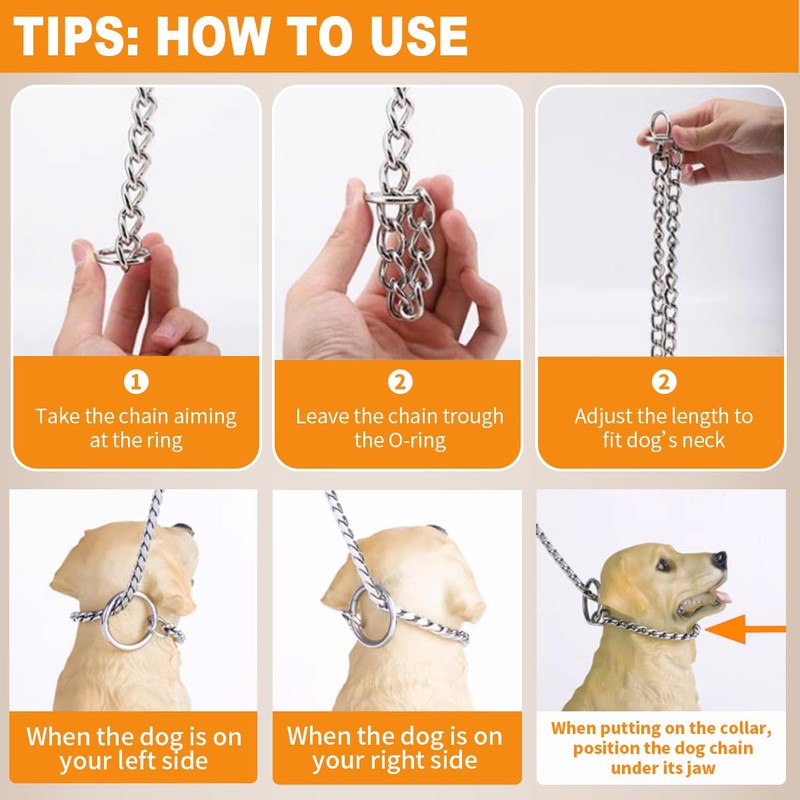 • 【Function】 1. Ergonomic Dragon Bone Ridge Design - Strategically contoured nodules apply gentle pressure to prevent pulling while avoiding choking 2. Anti-Lunge & Anti-Pull Mechanism - Dual-control system effectively reduces sudden forward bursts and sideways dragging 3. Progressive Training Technology - Gradual pressure adjustment adapts to training phases (from basic obedience to advanced behavior correction) 4. Comfort Design - Polished chain body reduces neck friction while maintaining responsive control
