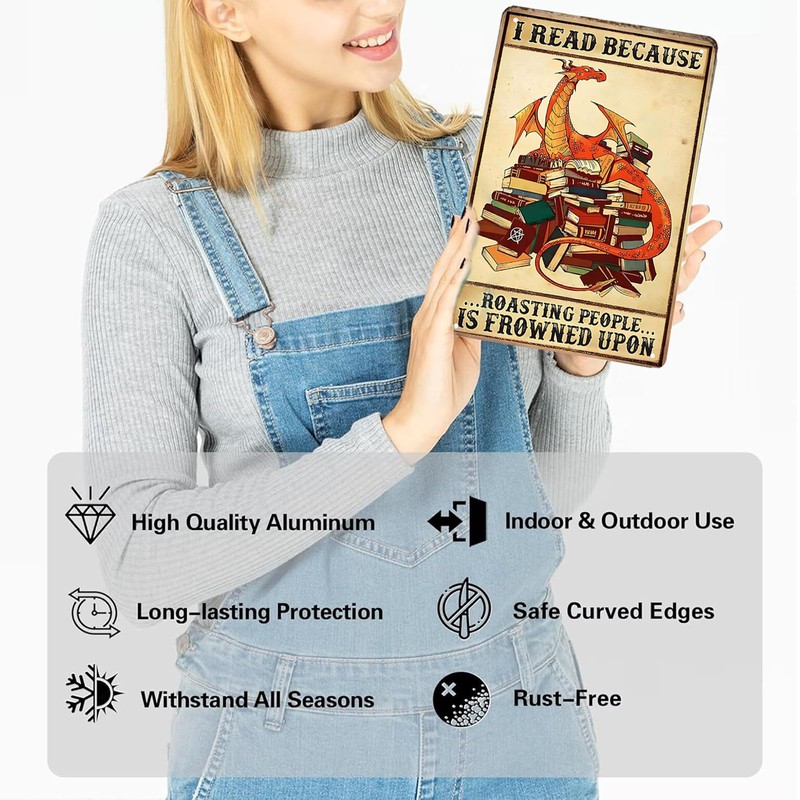 - 1.【Vintage Dragon Art】- Handcrafted tin sign features an intricate dragon surrounded by antique books, perfect for adding a mystical literary vibe to any space