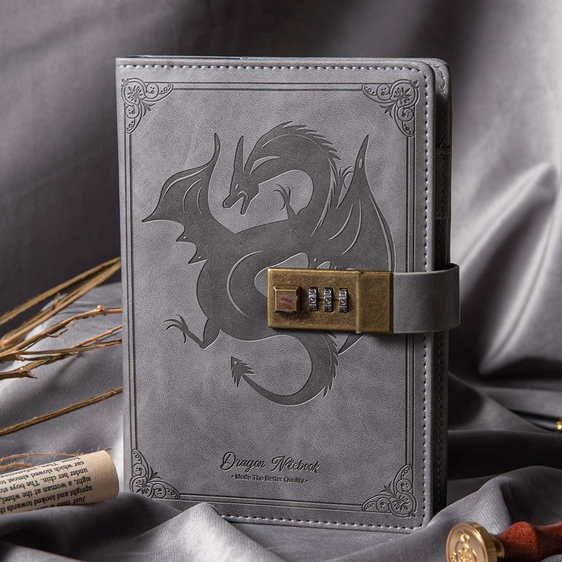 Dragon Leather Journal Notebook, Diary with Combination Lock, Lined/Blank Paper Notebook, B6 Writing Journals Stationery (Grey)
