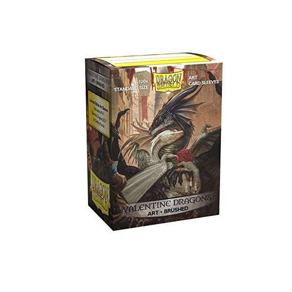 - Clear front and 'Valentine Dragons 2021' artwork by Godfrey Escota featuring last year's dragon couple on a new escapade. A greusome yet graceful piece. Dragon Shield Art Sleeves are printed directly on the sleeve and do not peel or split. Brushed brings full edge to edge artwork on sleeves possible with a lightly textured back giving them a silky smooth shuffle feel. No white borders, full art or colored frames.