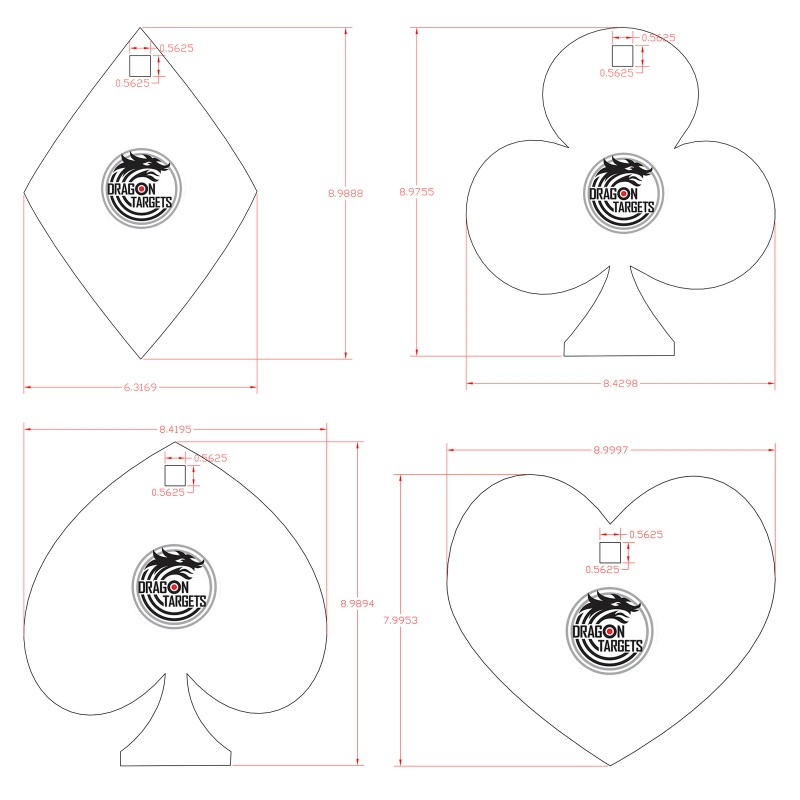 Professional grade AR500 steel shooting target by Dragon Targets. Get instant feedback when you hit a Dragon Target! When the targets are hit, they make a loud 'dinging' noise that lets the shooter know they are on point. See shooting chart for recommended distance and ALWAYS wear eye and ear protection while shooting at a Dragon AR500 Steel Target. Dragon Targets are made with AMERICAN AR500 Steel and finished in Texas. The Dragon Targets Poker Set Steel Targets x 3/8" Thick is painted with a custom formulated paint to eliminate glare and maximize visibility. Targets are painted with a thin coat of custom target paint to eliminate distracting paint cracks. Simply paint over targets when done or a few minutes before a shooting session. The Dragon Targets Poker Set Steel Targets x 3/8" Thick has one square hole per target to accept a ½" carriage bolt (not included) for hanging targets. Order today and start shooting like a pro!