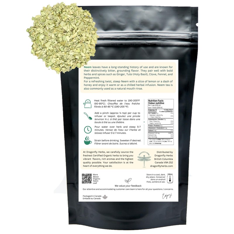 - ORGANIC NEEM LEAF TEA – Harvested from the Azadirachta indica tree, Neem Leaf Tea is bold and bitter, with a deep, earthy & bitter profile that stands out among herbal teas. Our dried Neem Leaf Tea is cut and sifted, then packaged in Canada in a resealable pouch package that protects against moisture, oxygen, and light. NON-GMO, NON-Irradiated.