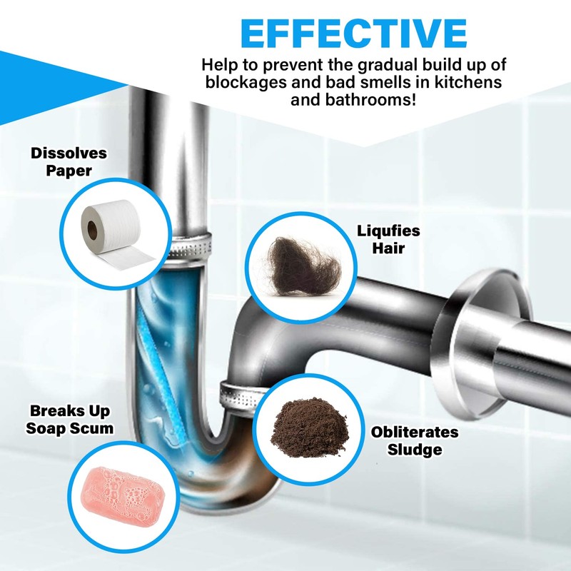 • ✅ VERSATILE - Ideal for use in the kitchen, shower trap, sinks and utility. The fast and effective drain unblockers help to remove bad smells and break down almost anything (soap scum and organic matter) that gets stuck in plugholes and pipes, causing blockages.