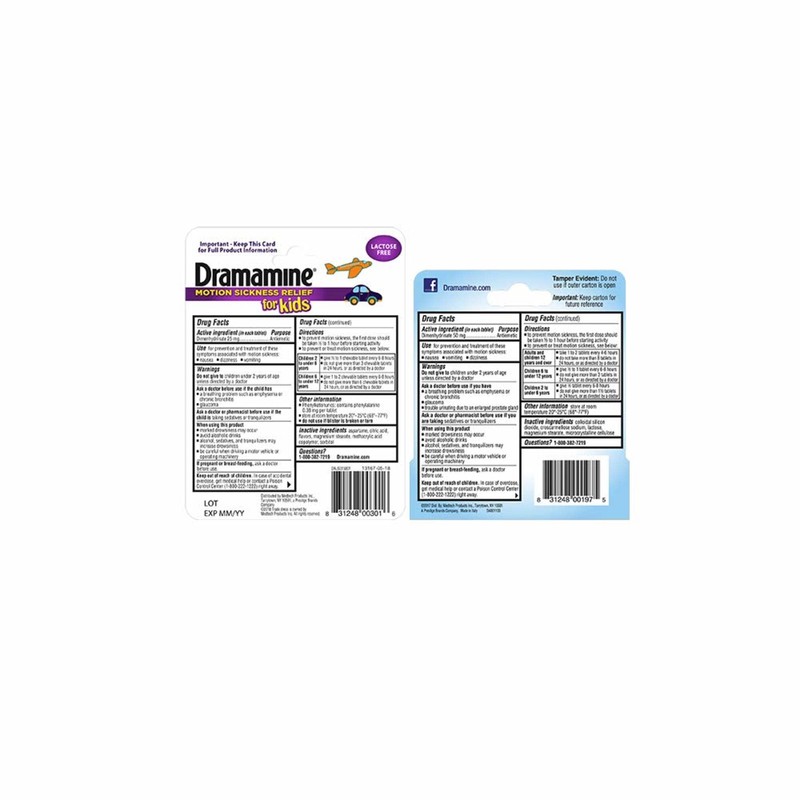 - Dramamine Family Pack contains 1 Dramamine for Kids Children's Chewable Formula, 8 tablets, and 1 Dramamine Original Formula, 12 tablets
