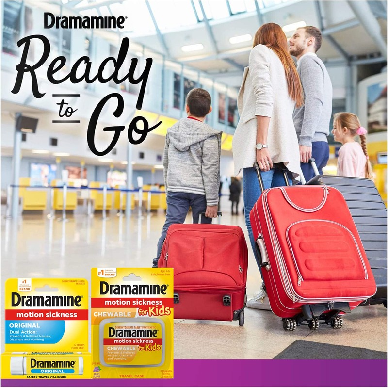 - Dramamine for Kids offers a safe and precise dose in a fun and chewable grape flavor; comes in a convenient, portable travel case ideal for on-the-go travel