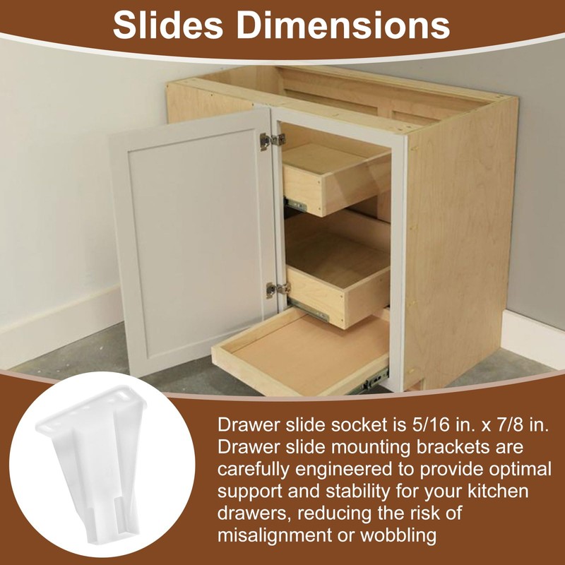 - Slides Dimensions: Drawer slide socket is 5/16 in. x 7/8 in. Drawer slide mounting brackets are carefully engineered to provide optimal support and stability for your kitchen drawers, reducing the risk of misalignment or wobbling.
