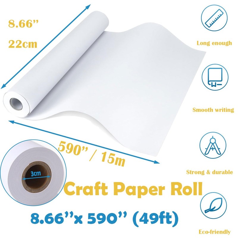 - White wrapping paper - 8.66 x 590.55 inches (22 cm x 15 m); industrial drawing paper roll made from recycled and recyclable materials. Reusable, durable, tear-resistant and smooth surface.