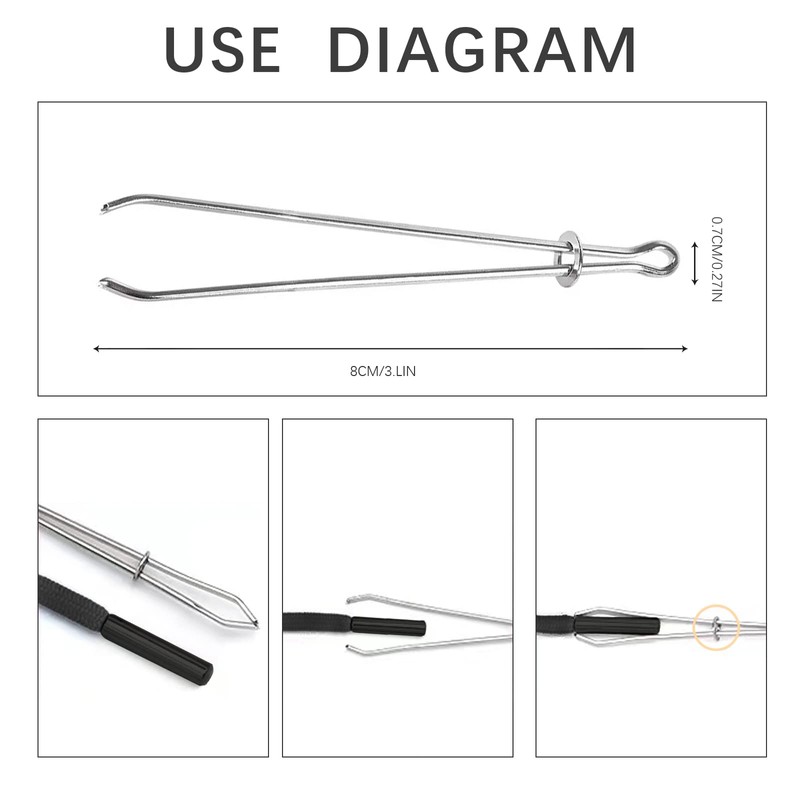 - The drawstring threader is easy to use, convenient and practical. You just need to run through the eyelet of your clothes, fasten the drawstring tightly, then you can adjust it to trousers and shorts with your hands.