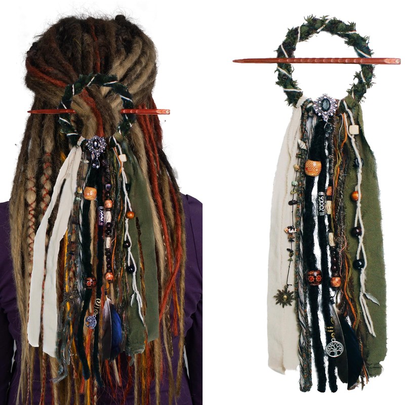 >>Handmade hair tie for dreadlocks, made of wooden beads, natural stones, yarn and fabric, metal accessories, feathers, shells, etc.