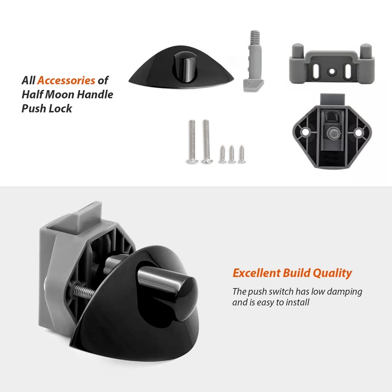 • This new Half Moon Handle Push Lock is suitable for your caravan, motorhome, camping trailer, boat, yacht, marine, etc as the door lock of cupboard, closet, drawer, counter, cabinet.