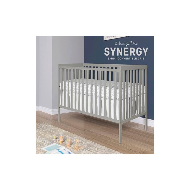 The Dream On Me Synergy 5-in-1 Convertible Crib is the perfect blend of style and substance, bringing together contemporary design with abundant features and a focus on safety. This gender-neutral crib grows with your child! It converts from a crib to toddler bed, toddler bed rail sold separately) a daybed and full-size bed (full-size bed frame and mattress not included). It also comes with a 3-position adjustable mattress support system. Safety and durability are never a concern with the Synergy Convertible Crib. It is built to last, made out of solid reclaimed New Zealand pinewood. All Dream On Me cribs is JPMA certified and meet all applicable ASTM and CPSC standards. All of our products are tested by third-party labs for lead and other toxic elements to meet or exceed CPSC and ASTM safety standards. The Synergy comes in beautiful, non-toxic finishes that allow you to create the nursery of your dreams - contemporary, whimsical, fairy, vintage - let your imagination reign supreme! This is a standard full-size crib and measures 53.0" L x 29.0" W x 39.0" H inches. For the best fit, we recommend any Dream On Me or Evolur full-size, non-toxic, Greenguard certified mattress.