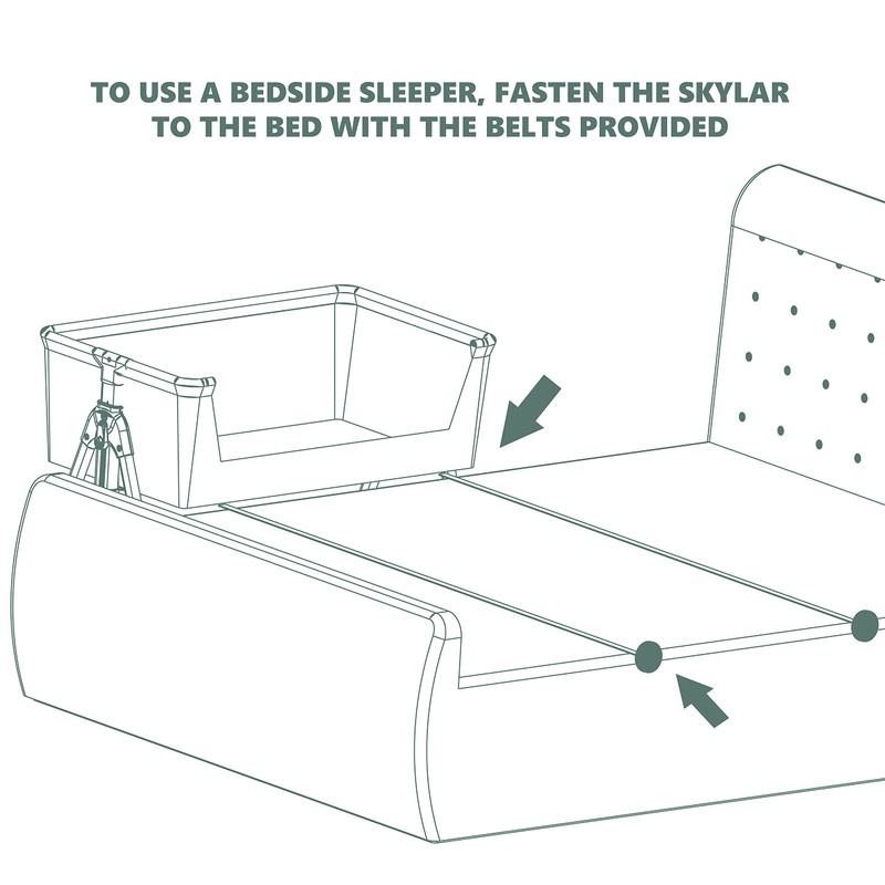Thoughtfully built, the Skylar Bassinet & Bedside Sleeper is ideal for the first few months of parenthood. Weighing a little under 19 pounds, the Skylar is lightweight and portable, making it ideal for small spaces. Use it as a bedside sleeper - the legs fold inward, getting it close to the mattress. Wheels on the front legs allow easy adjustability. The sturdy strap system allows you to easily secure the Skylar to your bed frame. The mesh sides, which can be zipped down, allow easy viewing of your baby and ensure full breathability. Lean in for breastfeeding or comforting your child through a restless night. The five-adjustable height mechanism (13-17.3″) accommodates all types of beds, leaving no gaps and is also easy on your back. Set-up is quick, thanks to a tool-free assembly. The Skylar is available with aluminum frames. It comes in three colors, allowing it to blend in beautifully with your nursery. The Skylar meets all ASTM standards. It comes with the regulatory 1-inch mattress pad (32.5Lx19.5Wx1H inches) and is recommended for babies up to 25 lbs or 6 months of age. Bassinet dimensions are 35.5Lx22Wx27H inches.