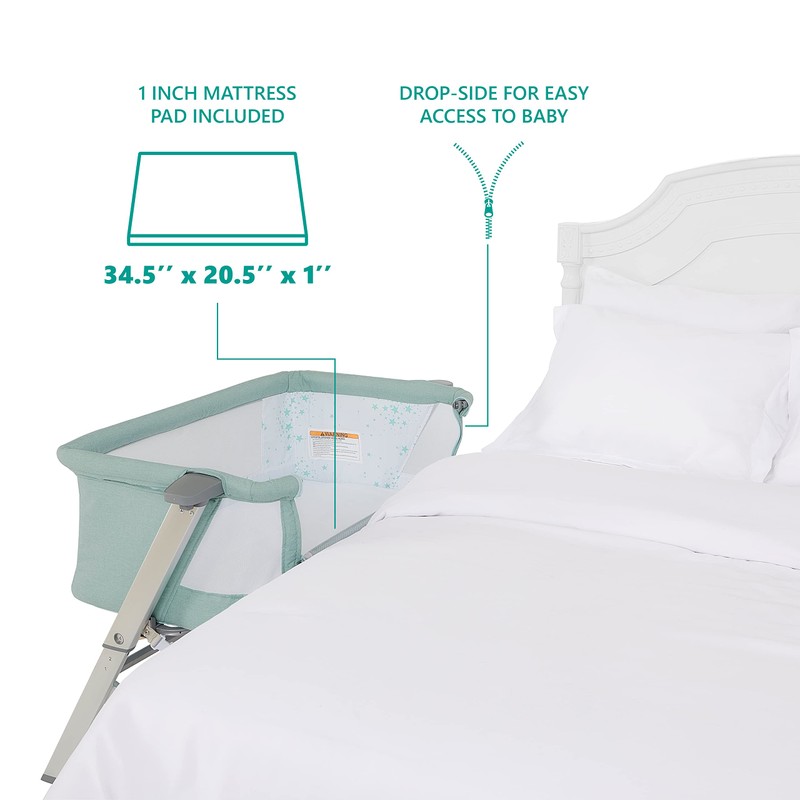 - DUAL USE: Unzip and roll down the mesh sides to convert the bassinet into a bedside sleeper. Lean in for breastfeeding or comforting your child. Five adjustable heights (Adjusts from 26.5 > 27.5 > 28.5 > 29.5 > 30.5”) Able to be used with a queen mattress leaving no gaps and is also easy on your back