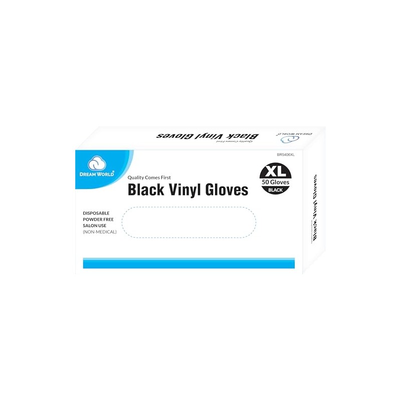 Dream World Extra Large Vinyl Gloves Black 50 Pcs Box are made with high-quality PVC to ensure no tearing from formula. These gloves are disposable, powder free, and for salon use.