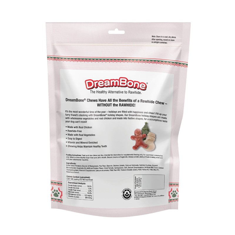 Dream Bone chews have all the benefits of a rawhide chew…WITHOUT the RAWHIDE. No-rawhide Dream Bone chews are made with real vegetables and chicken for a scrumptious taste dogs can’t resist! It’s the most wonderful time of year — Holidays are filled with happiness and cheer! Fill up your furry friend’s stocking with Dream Bone holiday shapes. Our Dream Bone holiday shapes are made with wholesome vegetables and real chicken and Made into festive shapes, for a scrumptious taste your dog can’t resist! The 6-count bag contains two of each holiday shape. Made with real vegetables and chicken and vegetables, These rawhide-free chews are easy to digest, vitamin and mineral enriched and a healthy alternative to rawhide. Chewing helps maintain healthy teeth. Feed your dog up to two chews per day. Always supervise your pup during chewing activity and provide access to fresh, clean water. These chews are intended for intermittent or supplemental feeding only. Store in a cool, dry place. After opening, reseal or store in an airtight container to preserve freshness. The experts at Dream Bone brand want you to have healthy, happy dogs. We know that your dog is more than a pet — they’re family.