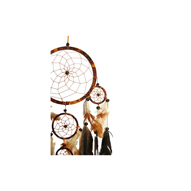 This beautiful dream catcher gives your bedroom a very special ambience. The five differently arranged rings form a harmonious contrast to the softly falling feathers and convey the feeling of a sunny autumn day in their colours. This dream catcher conjures up a touch of Indian culture in your home. The dream catcher sets accents and is a decorative accessory of a very special kind.