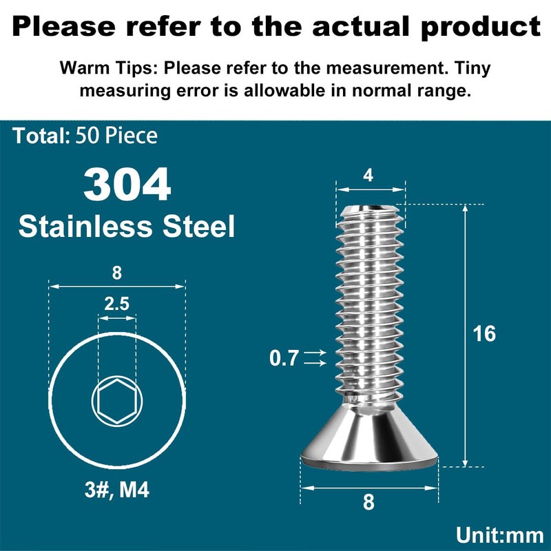 • Product Parameters: Size: M4 x 16mm, quantity: 50 pieces, type: DIN 7991 (ISO 10642) countersunk screws with hexagon socket, fully threaded.