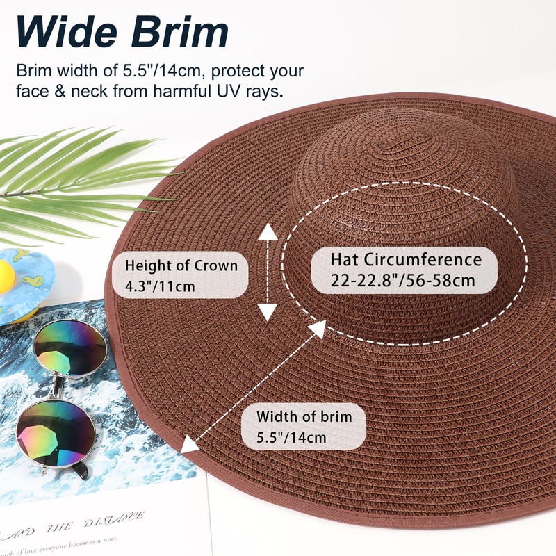 • This beach hat has a circumference of 22.1"-22.8"/56-58cm, a brim of 5.5"/14cm and a height of 4.3"/11cm. You can adjust the size of the hat through the strap inside the hat.