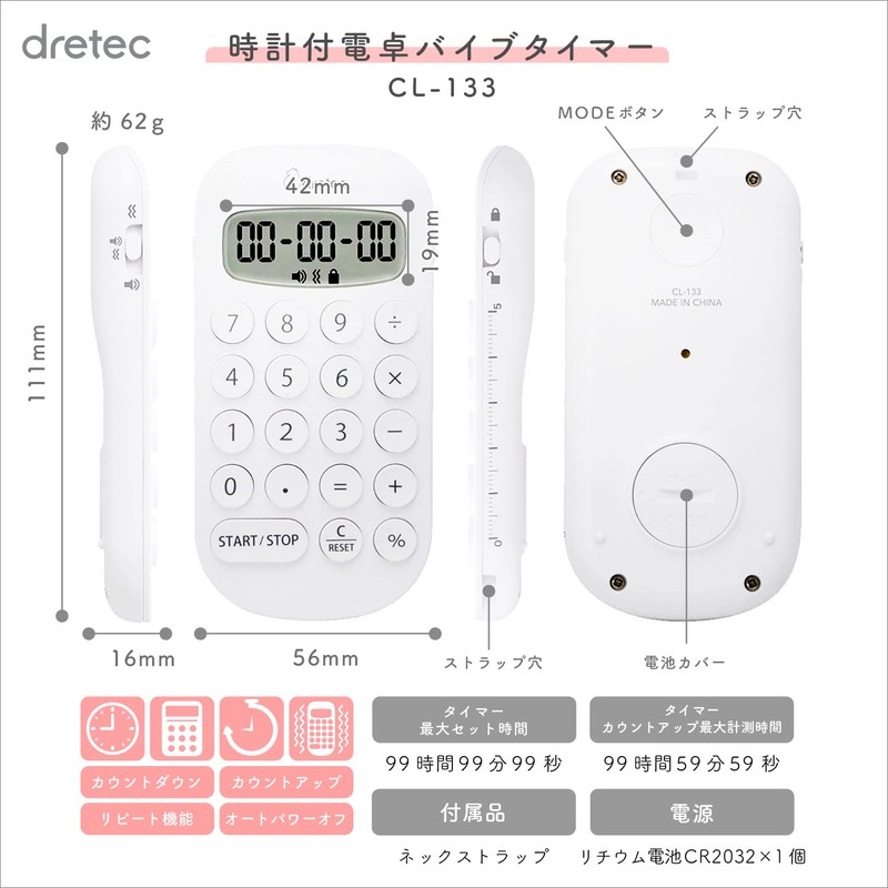 dretec Calculator with Clock Vibe Timer Clock Calculator Timer with Clock White