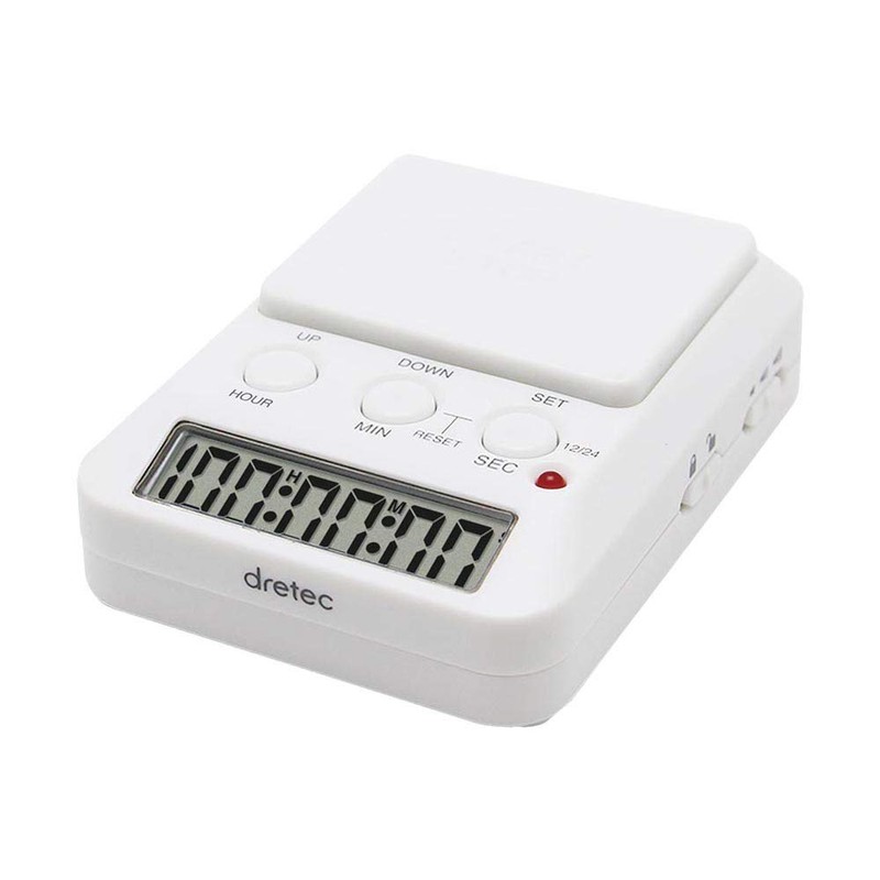 - Maximum timing: timer (minutes) 199 minutes 59 seconds, timer (hours): 199 hours, 59 minutes, 59 seconds / Minimum time (seconds): 1 - Width: 2.4 inches (60 mm) / Depth: 3.1 inches (80 mm) / Height: 0.9 inches (23 mm) / Color: White / Power supply: 2 x AAA batteries