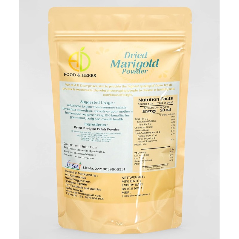 - Dried Marigold Powder is made from the dried petals of the marigold flower (Tagetes species), a vibrant, aromatic flower commonly found in gardens. Marigolds are celebrated for their bright yellow, orange, and red blooms, and their petals are rich in compounds that offer both medicinal and cosmetic benefits. The powder is typically made by drying the petals of the flower and grinding them into a fine powder.