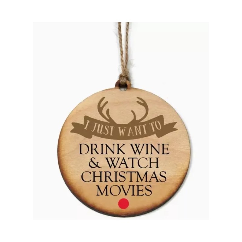 driftless studios Wooden Christmas Ornament, "I Just Want To Drink Wine" Design, 3.25 in Diameter