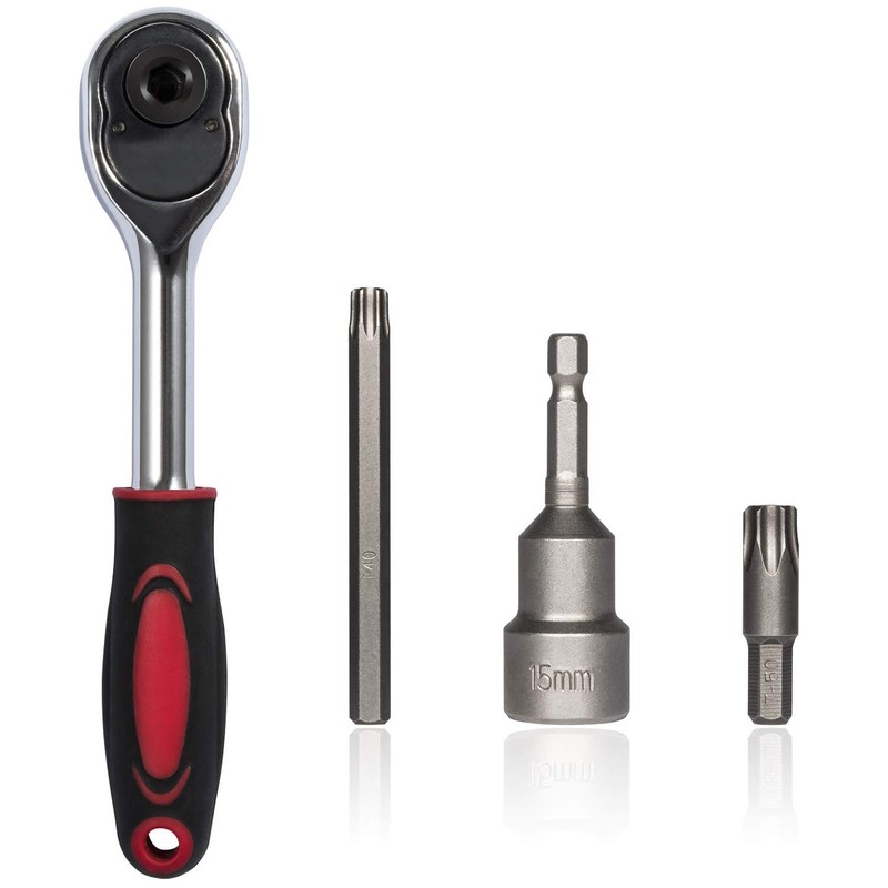 - Tool Kit contains the following: 5-5/16" Ratchet;T50 Torx Bit;T40 Torx Bit;15mm Socket