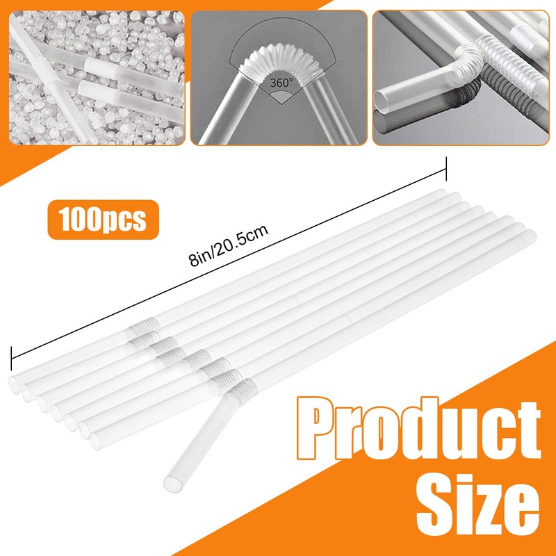 - Packing Include: Comes with 100 count Each Straw is 7.67 inch extra long, the Bendable part is 0.4 inch when the Flex part is closed, 0.196 inch diameter. After stretched approx. 8.07 inch