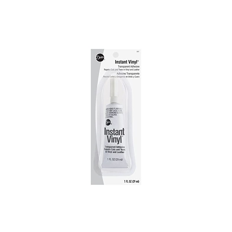 - Dritz Instant Vinyl Transparent Adhesive 1 1/4th oz. Ideal for mending tears and cuts in leather and vinyl. Perfect for handbags, shoes, luggage, and furniture cushions. This adhesive dries flexibly and instantly.