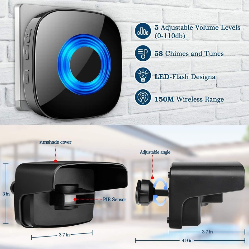 - [Easy to install]: plug the receiver into the socket, simply pair the motion sensor with the receiver, and mount the detector anywhere with the included screws. Alerts business owners or homeowners with a wireless doorbell. The ability to detect movement through the front or back door. We provide 12 months customer service. If you have any problem, please contact us freely.