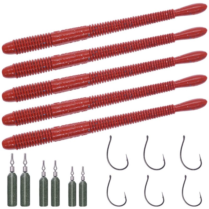 Drop-Shot-Rigs-for-Bass-Fishing-Soft-Plastic-Lures-Worm Fishing Hooks, 4.5 inch Rubber Worms, Wacky Worms, Straight Tail Stick Baits -22 Piece Kit with 10 Bodies, 6 Hooks, 6 Weights