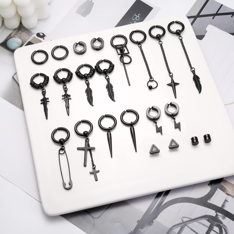 Drperfect 22Pcs Dangle Clip On Earrings for Men Fake Earrings Stainless Steel Cross Sword Feather Lightning Hinged Hoop Non-Piercing Earrings Set Black Silver Tone